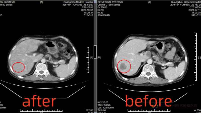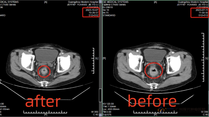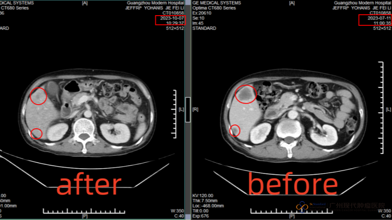 After I arrived at the hospital, the MDT medical team of the hospital consulted me and formulated a comprehensive treatment of "intervention + cryotherapy". Before the treatment, the tumor in the anus was about 29mmx38mm, but after an intervention, the tumor was reduced to 13mmx17mm, and the multiple metastatic foci in the liver were mostly invisible on CT after cryotherapy. Both my wife and I are very happy with this result.