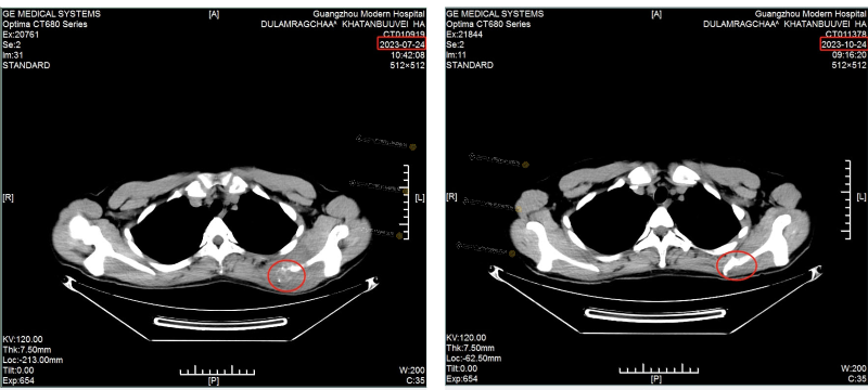 [The right picture shows the CT of the scapula in October: tumor disappeared]