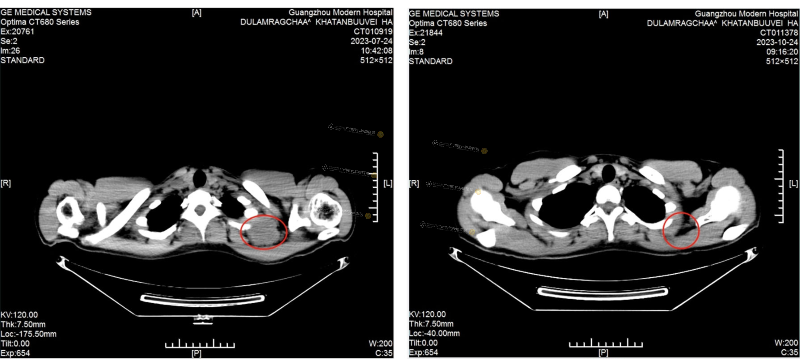 [The left picture shows the CT of the scapula in July: the size of the tumor is about 46mm×79mm and has invaded the scapula]